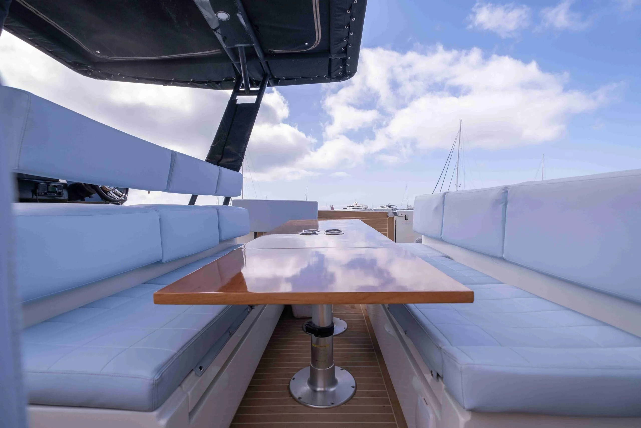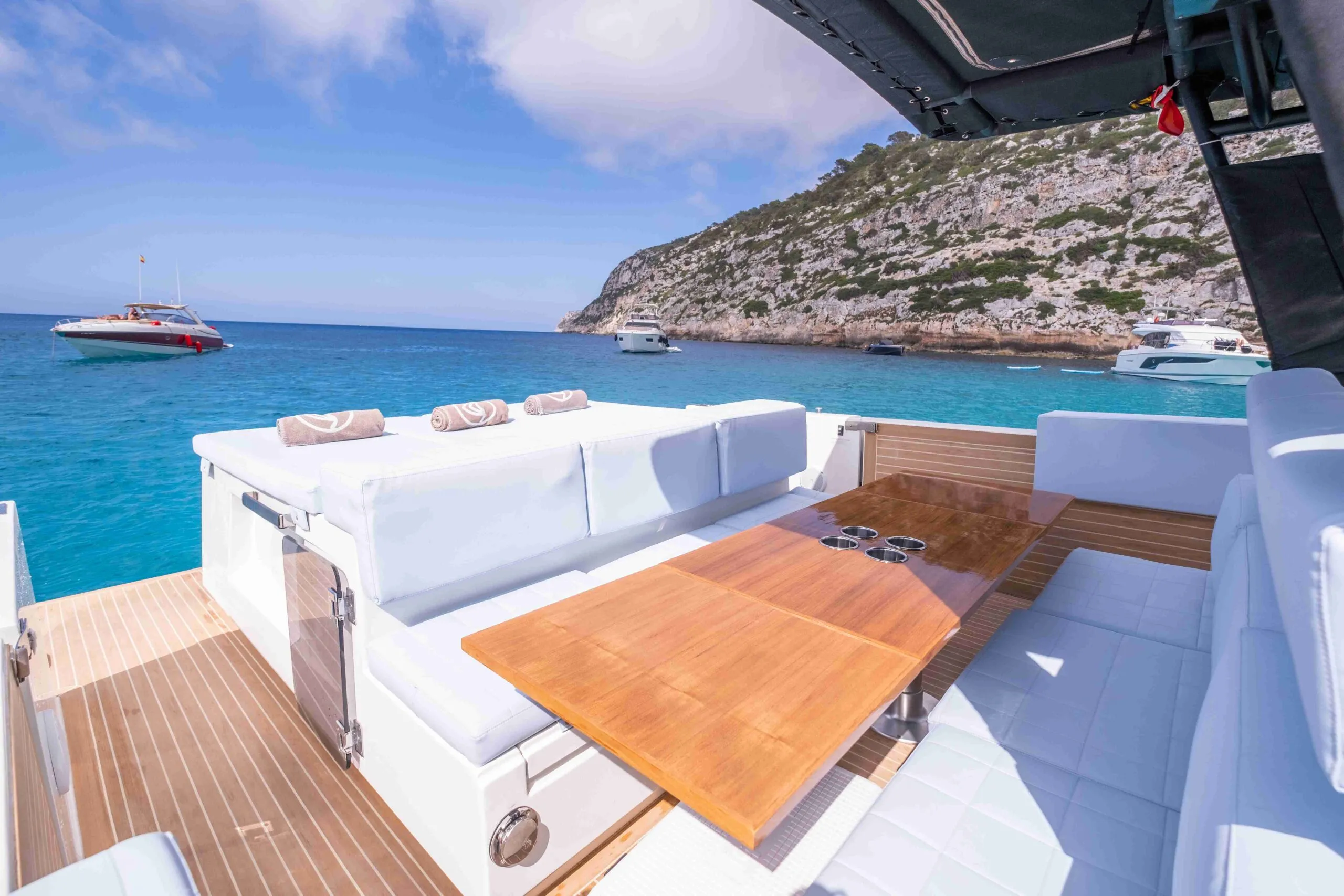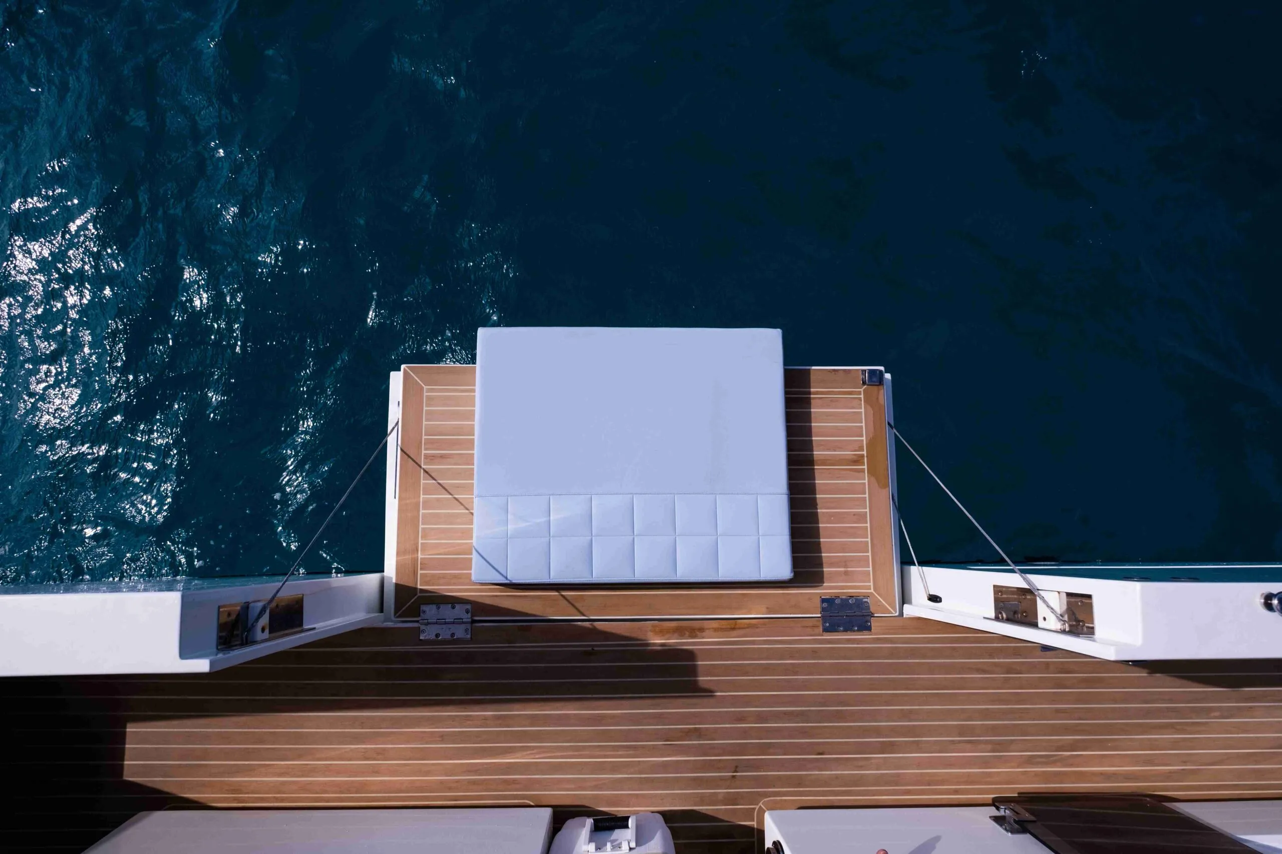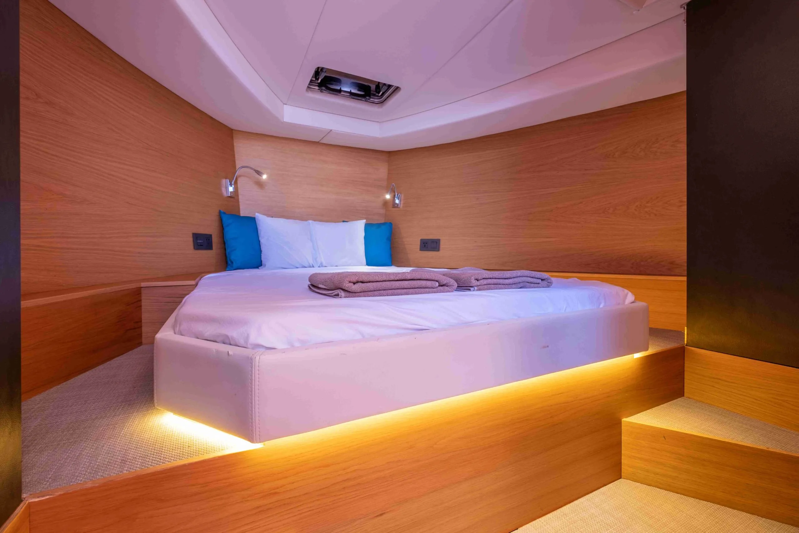 Equipamiento: Plataforma xl, solárium de proa y de popa, sonda GPS, equipo de música, equipo de snorkel, toldo de sol extensible de popa, paddle surf.